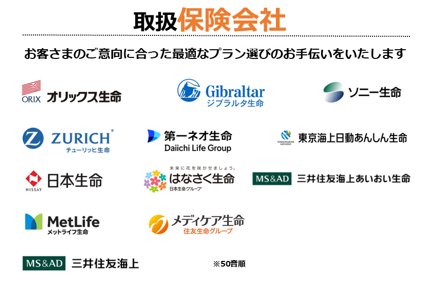 取扱保険商品では、「生命保険」では医療保険、がん保険、個人年金保険、学資保険、介護・認知症保障保険をはじめ、死亡保障では収入保障保険や、最近人気の「外貨建保険」や「変額保険」など。「損害保険」では、火災保険、自動車保険、傷害保険、各種賠償責任保険、法人向け商品も取扱いしております。